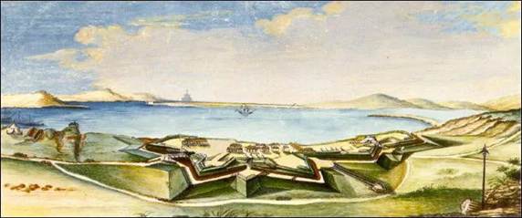 Возведённая казаками Фанагорийская крепость была бастионного типа, в виде полуокружности, прижатой хордой к обрыву моря. Протяженность вала со стороны суши составляла 574 сажени, а вдоль моря – 325 саженей (сажень =213,36 см). Ворота Азовские выходили на восток, а Нимфейские – на запад. Три полных бастиона – Петра, Владимира и Павла прикрывали крепость со стороны суши. Подступы под обрывами прикрывались полубастионами Бориса и Глеба. Артиллерийские батареи крепости состояли из 90 орудий. В центре крепости находился плац, вокруг которого располагались казармы офицеров и цейхгаузы – склады военного имущества, оружия и вооружения.